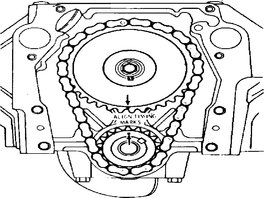 4. Install cam gear, crank gear and timing chain with timing marks aligned, Fig. 30. Torque cam gear bolt to 64 ft. lbs. on 1982 models, or 70 ft. lbs. on 1983-85 models.