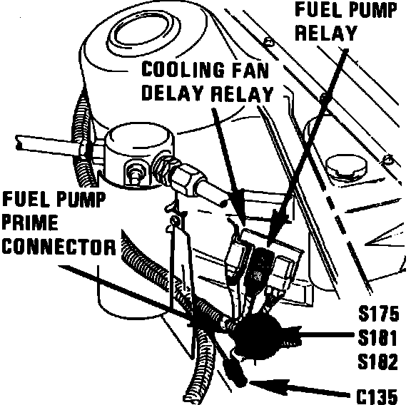 The Fuel Pump Relay is located ahead of LH front shock tower, on relay bracket.