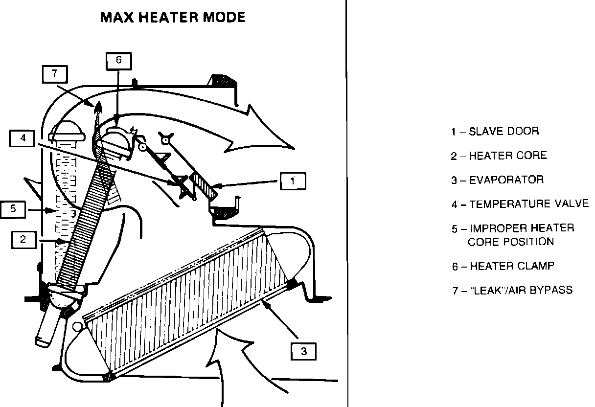 2. Inspect the alignment of the heater core to the case. Be sure the core is properly sealed to the case. The C68 automatics use a copper brass core different from the C60 manuals, which use an aluminum core with plastic in/out tubes. It is possible in manufacturing to improperly install the C68 copper brass core in the case; thus allowing cold air to bypass the core (See Illustration 1), and blend in with the hot air from the core before entering the passenger compartment.