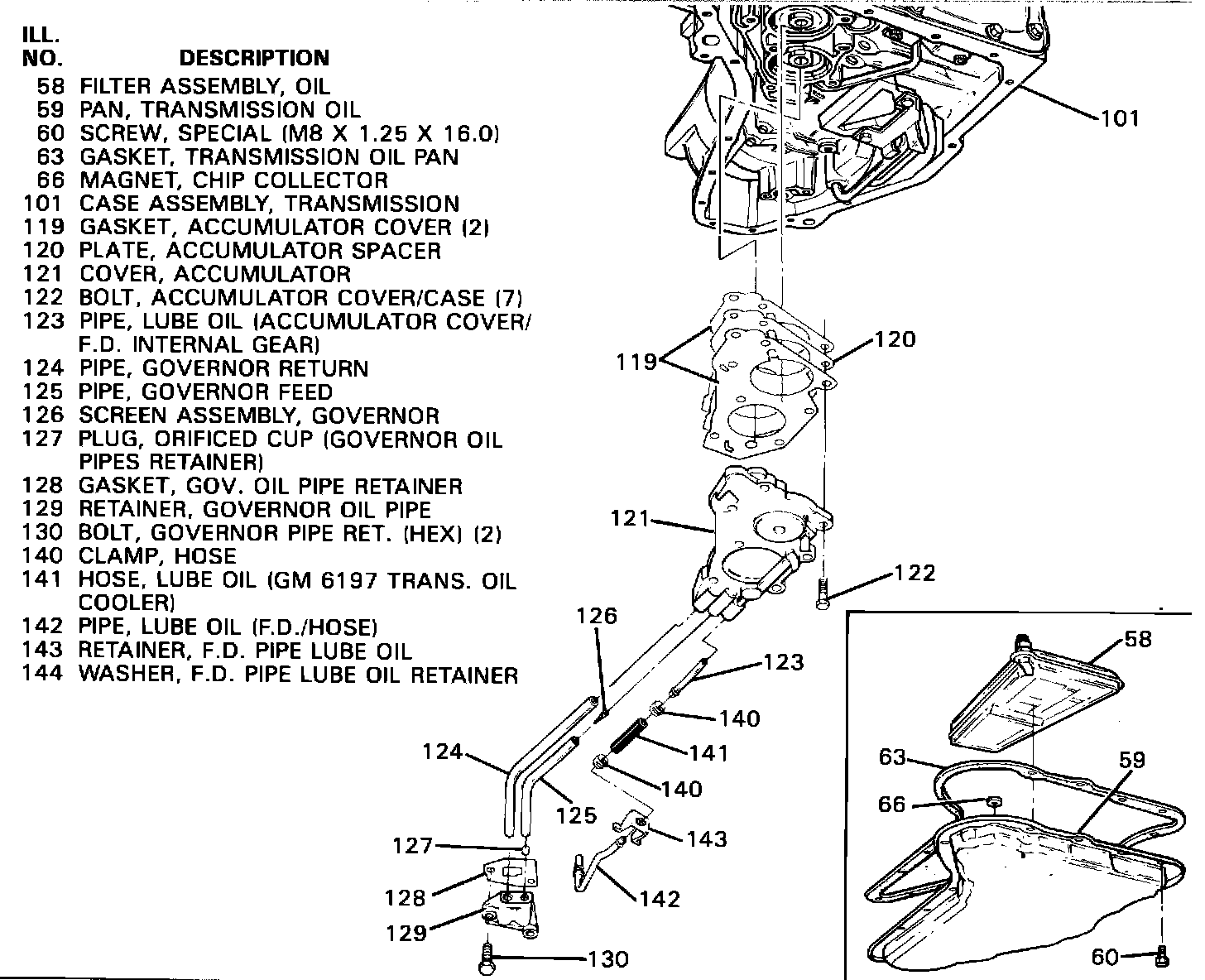 Transaxle Bottom Pan (59) Filter (58) Accumulator Cover (121) With Governor Pipes (124, 125) Governor Pipe Retainer (129) Accumulator Cover Spacer Plate (120) Gaskets (119)
