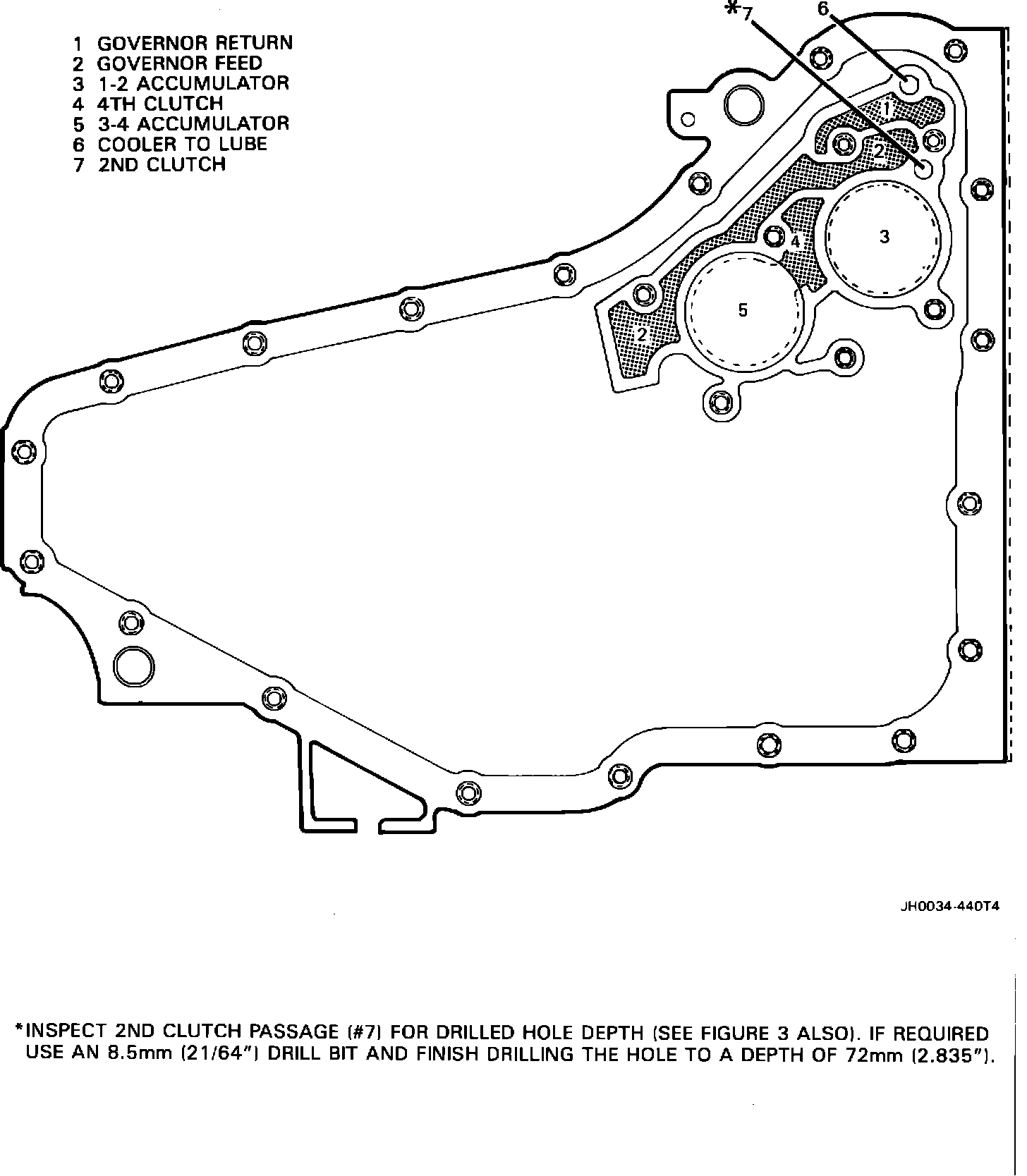 Inspect the 2nd clutch passage by measuring the hole depth which should be a minimum of 72 mm (2.835"), as shown in Figures 2 and 3. If the 2nd clutch passage is properly drilled, refer to the THM 440-T4 Diagnosis Section in your service manual for other possible causes of a harsh 1-2 shift condition.