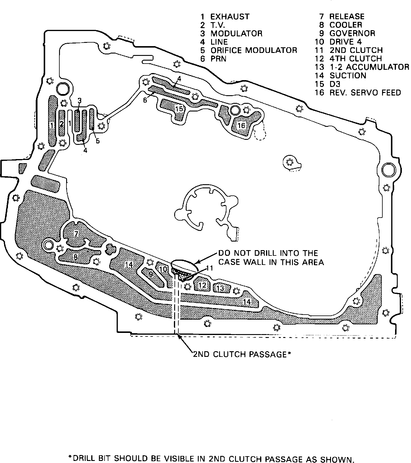 NOTICE: AVOID DRILLING TOO DEEP INTO THE 2ND CLUTCH PASSAGE BECAUSE IT WILL DAMAGE THE CASE.