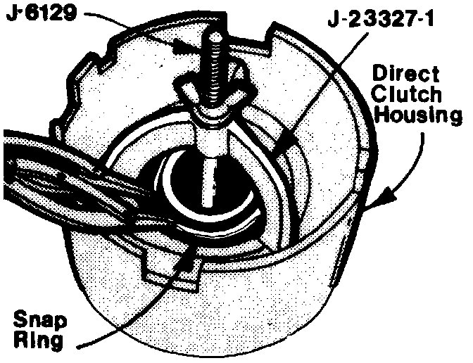 4. Using tools J-23327-1 and J-6129, compress retainer and spring assembly and remove snap ring, see image, and inspect for damage or distortion.