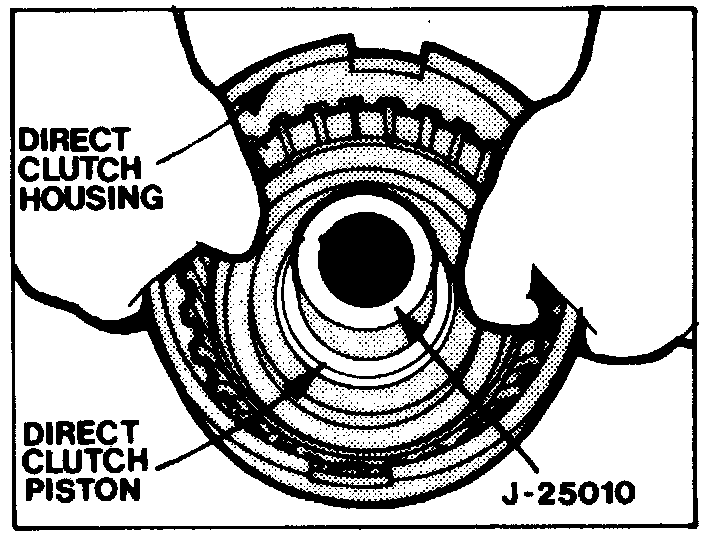 14. Install new center seal on direct clutch housing with lip facing up, then install seal protector J-25010 over oil seals. Use extreme care when installing direct clutch piston past larger direct clutch snap ring groove, as groove may cut outer seal on piston.
