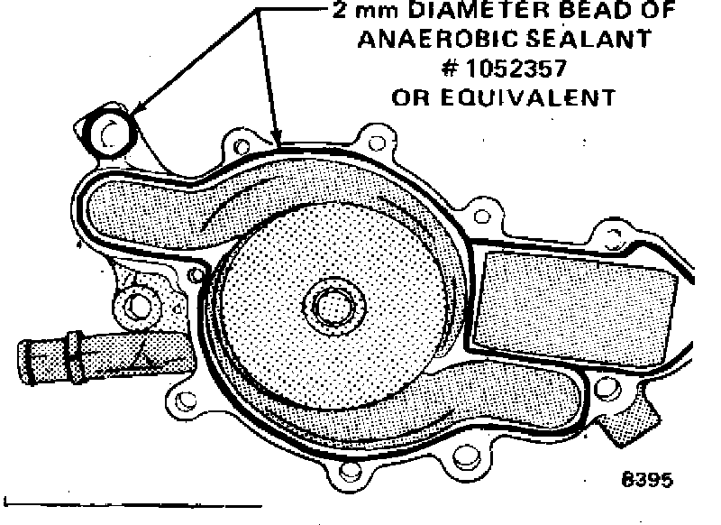 2. With sealing surfaces cleaned, place a 1/8 inch bead of sealant, part number 1052289 or equivalent, on water pump sealing surface.