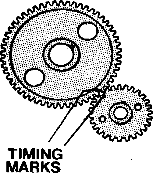 When installing timing gears, make sure that the marks on the gears are properly aligned, Fig. 14. The valve timing marks, Fig. 14, do not indicate TDC, compression stroke for No. 1 cylinder for use during distributor installation. When installing the distributor, rotate engine until No. 1 cylinder is on compression stroke and the camshaft timing mark is 180° from the valve timing position shown in Fig. 14.