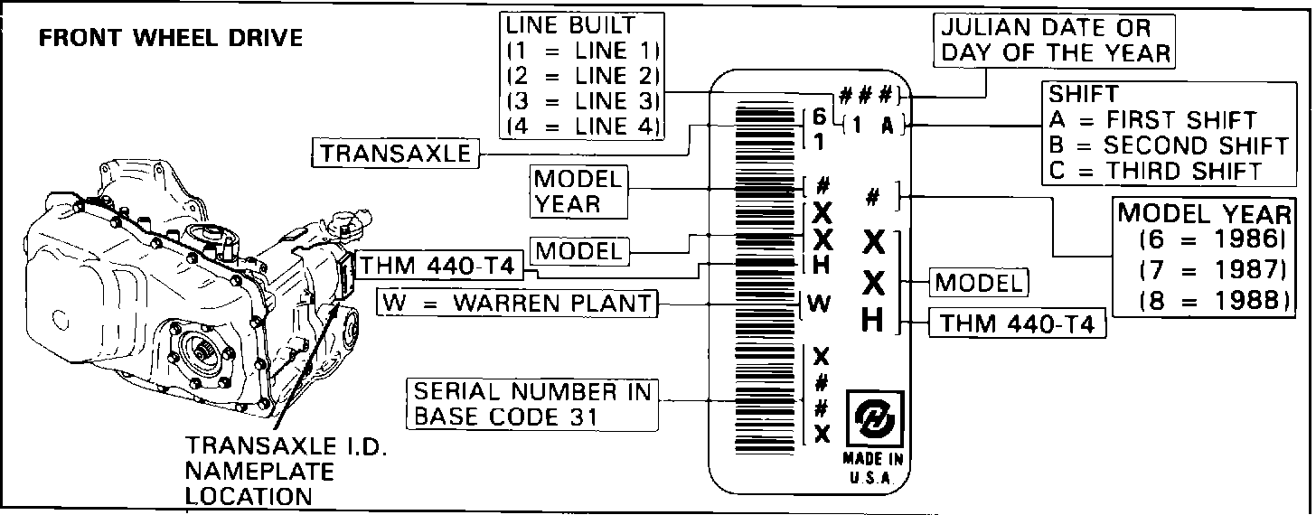 FIGURE 1 - THM 440-T4 TRANSAXLE IDENTIFICATION INFORMATION: