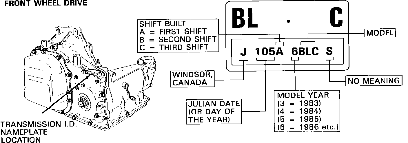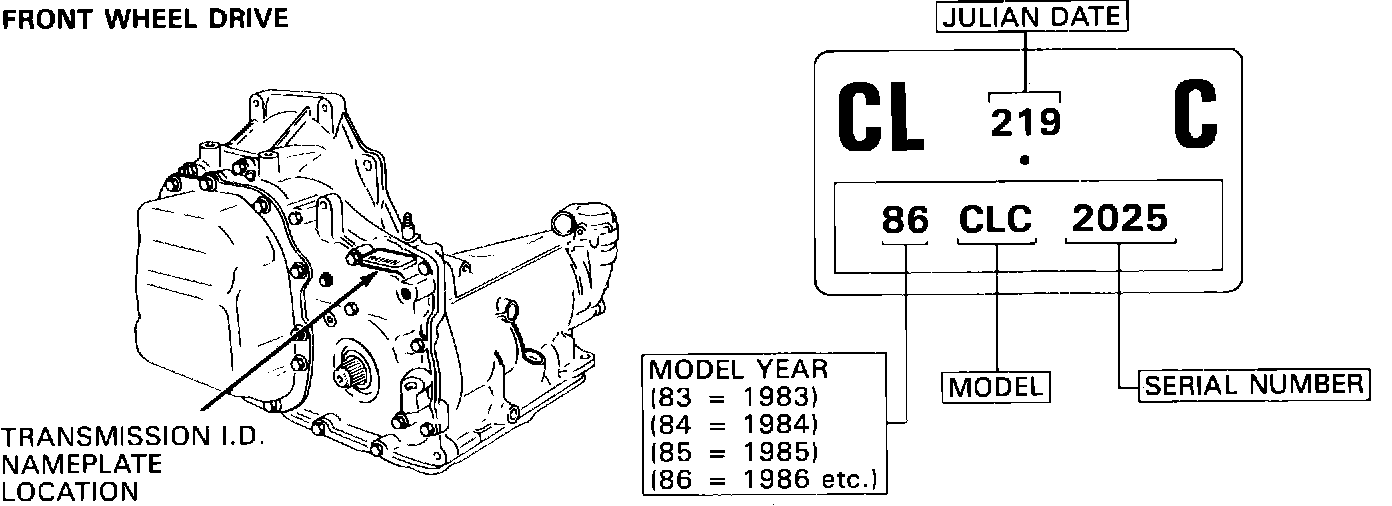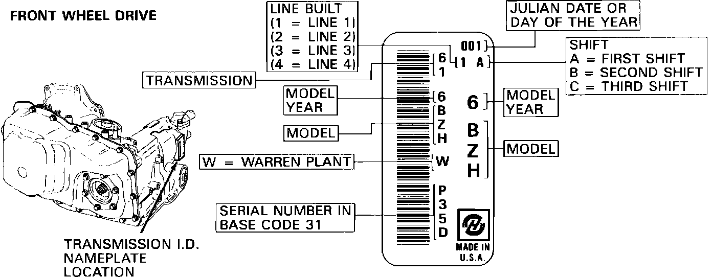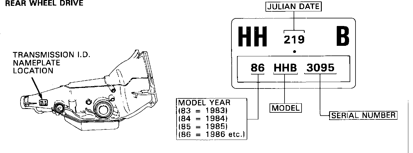 The transmission identification tag or stamped identification contains such information as transmission type, model year, model, serial number, and Julian date.