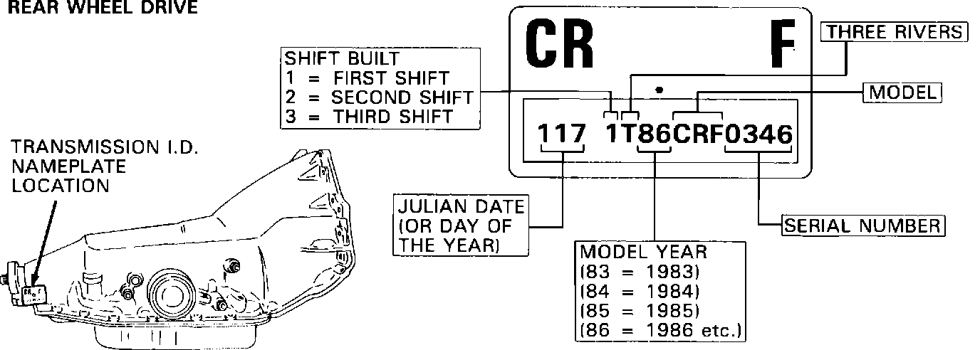 MODEL: Beginning with the start of 1986 production, all THM transmissions will have a 3-letter model designator as opposed to the 2-letter model designator used in previous years. The third letter in each code group will identify the type of transmission as follows: