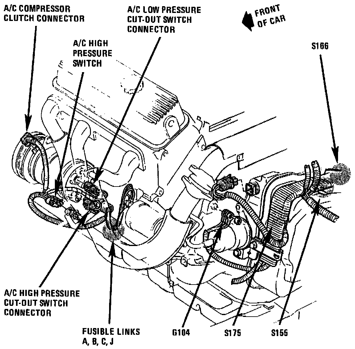 The The A/C Compressor Clutch Diode is taped inside the compressor clutch connector. The Compressor Clutch Connector is located on the RH front of engine, on front of compressor.