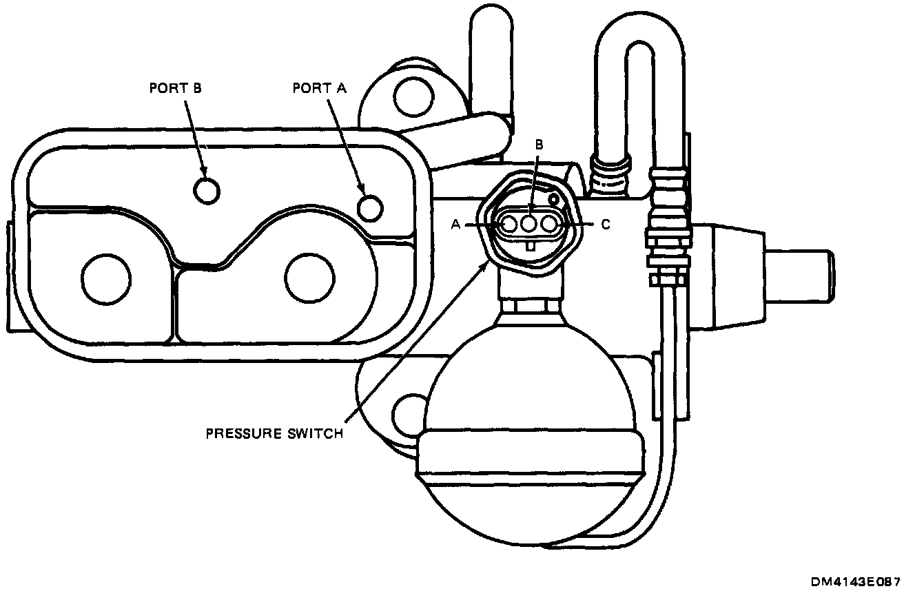 5. Turn ignition "OFF" and remove pressure switch electrical connector. With ohmmeter connected to switch terminals B/C and ignition "OFF", slowly bleed off accumulator pressure. B/C should close at 355-435 psi. This is the low pressure warning signal.