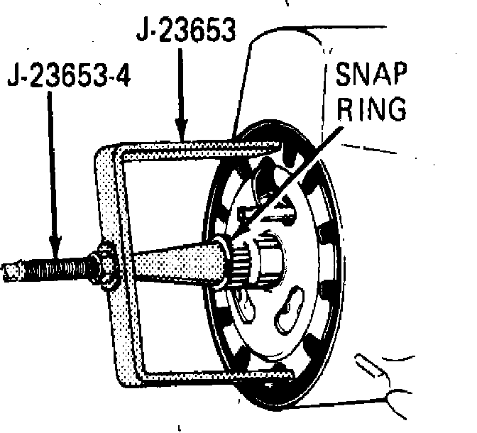 4. Using lock plate compressing tool J-23653-4, compress lock plate and pry snap ring from groove on steering shaft, Fig. 6. Slowly release compressing tool, then remove tool and lock plate from shaft.