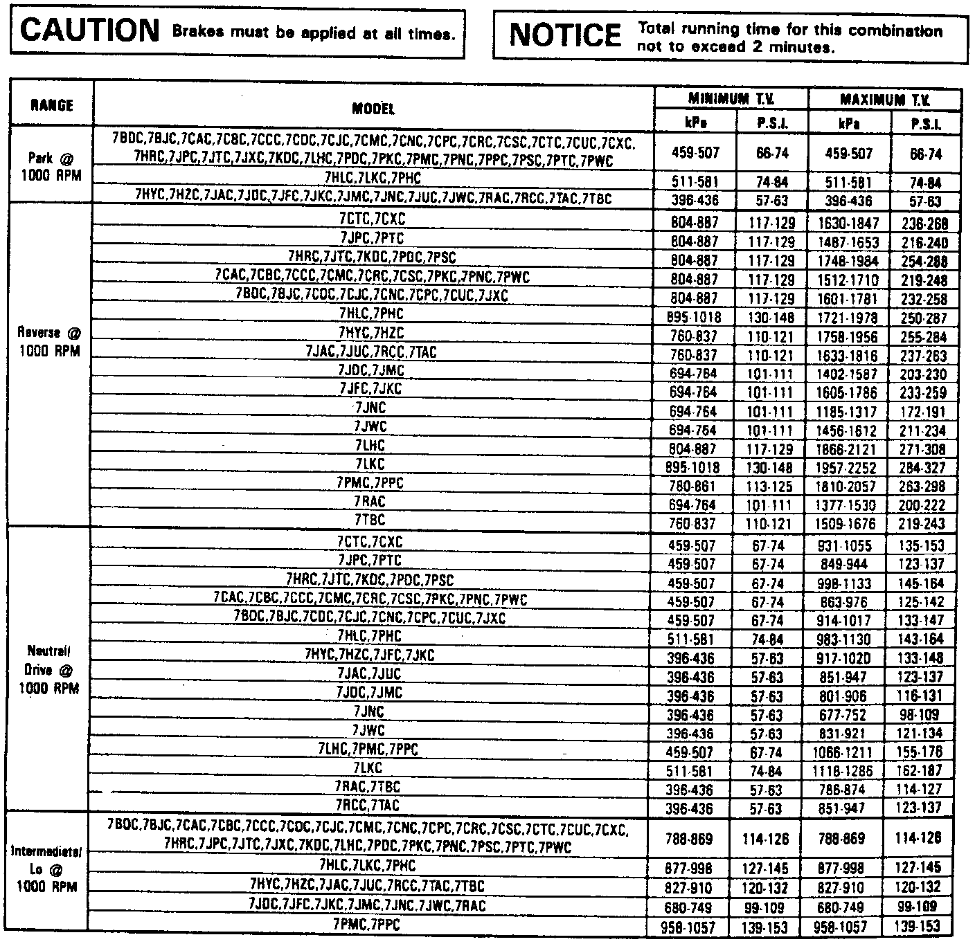 7. To check full throttle valve line pressure, tie or hold the T.V. to the full extent of its travel, then with brakes applied, transmission in range specified and engine at specified speed, check pressures according to chart.