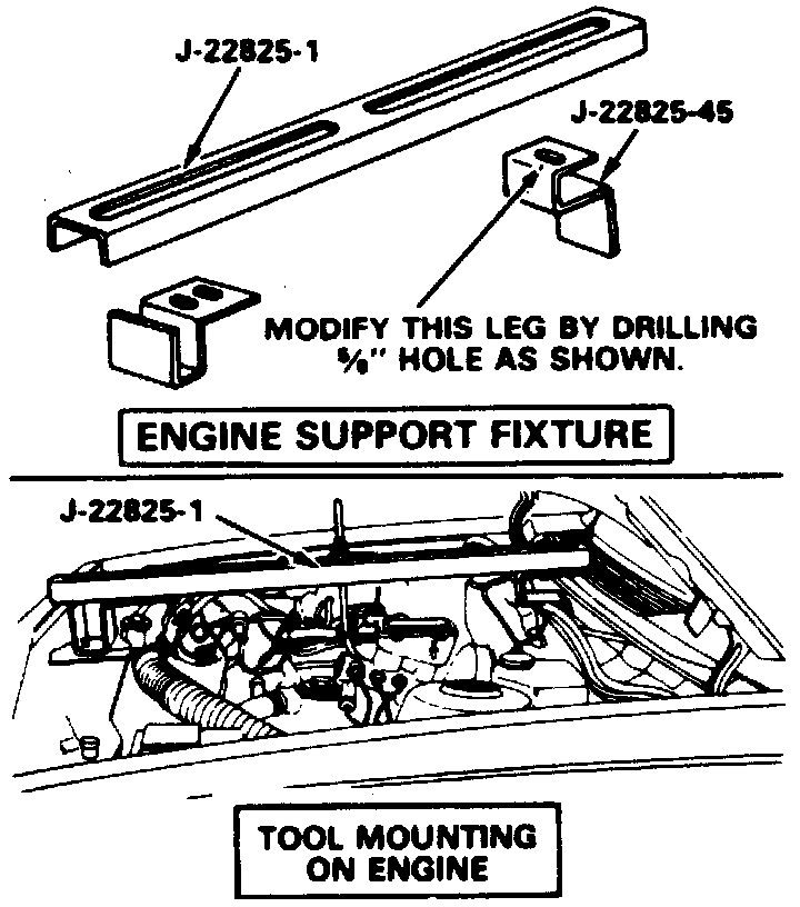 2. Install engine support fixture so that one end is supported on cowl tray over the wiper motor and the other end rests on the radiator support. Connect fixture hook to engine lift ring and raise engine to relieve weight from engine mounts, see accompanying figure.