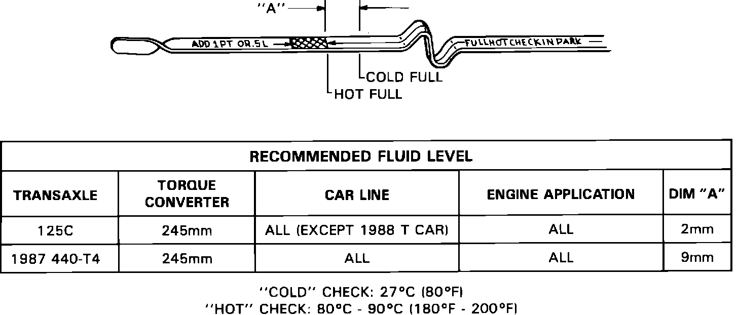 When cold, 27~C (80~F), a full THM 125C and 440-T4 transaxle will show the fluid level to be above the "Full Hot" mark on the fluid level indicator (refer to Figures 2 and 3). This is a result of the fluid that is stored in the bottom pan when the transaxle is cold. As the transaxle warms to normal operating temperature fluid is captured in the side pan, lowering the fluid level to within the cross-hatched area on the fluid level indicator.