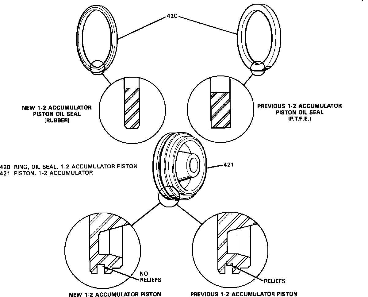 A new 1-2 Accumulator Piston (421) and Seal (420) for vehicles equipped with a THM 125C transaxle to increase shift consistency during vehicle operation in cold weather conditions. The groove bottom on the 1-2 accumulator piston where the seal is located is flat and the new piston seal is now made of a soft rubber instead of a hard P.T.F.E material (Refer to Figure 2).