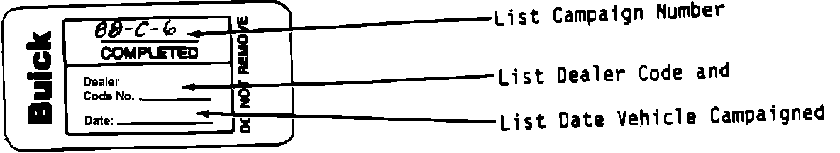 Each vehicle corrected in accordance with the instructions outlined in this Product Campaign Bulletin will require a "Campaign Identification Label". Each label provides a space to include the five (5) digit dealer code of the dealer performing the campaign service. This information may be inserted with a typewriter or a ball point pen.