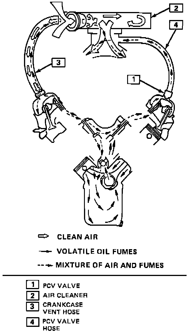 The PCV system prevents blow-by gases from escaping by routing them through a vacuum controlled ventilation valve and a hose into the intake manifold. The blow-by gases mix with the air/fuel mixture and are burned in the combustion chambers. When the engine is running, fresh air is drawn into the crankcase through a tube or hose connected to the air cleaner housing.