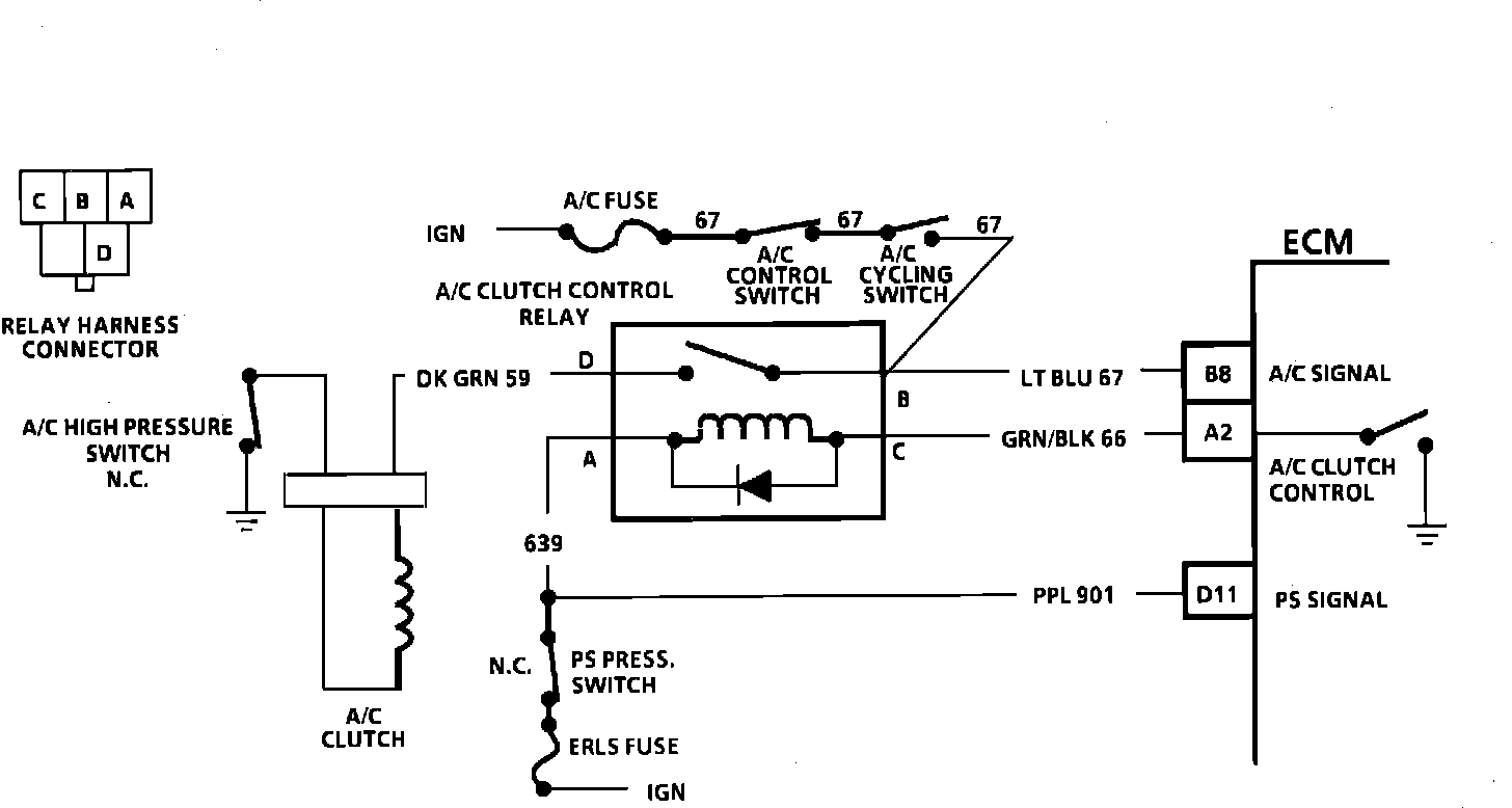 The power steering pressure switch opens when power steering pressure goes high, such as on a full turn in either direction. When the power steering switch opens, it turns the A/C relay "OFF," and also sends a signal to the ECM. The ECM uses this signal for idle control.