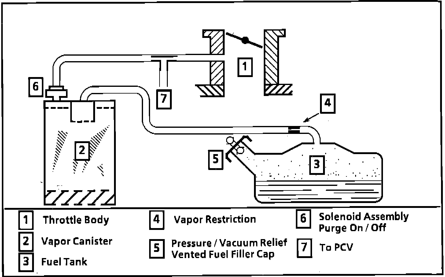 The evaporative emission control system used on this vehicle is the charcoal canister storage method. This method transfers fuel vapor from the fuel tank to an activated carbon storage canister to retain the vapors when the vehicle is not operating. When the engine is running the fuel vapor is purged from the carbon element by intake air flow and consumed in the normal combustion process.