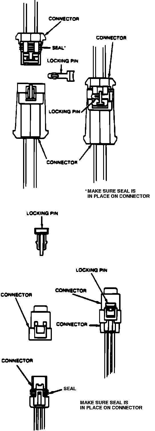 Always remove the locking pin prior to disconnecting electrical connector. Use extreme caution as to not damage locking pin during removal or installation. Note position of rubber seals when disconnecting connectors for installation purposes. Always reinstall locking pins after reconnecting connector.