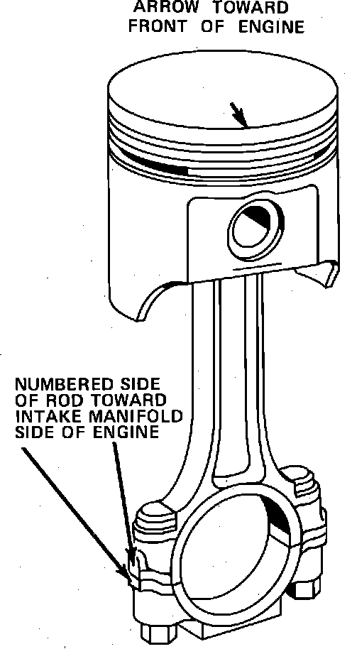Assemble piston to rod, with arrow on piston facing toward front of engine and numbered side toward intake manifold side of engine, Fig. 12. Upon installation, measure connecting rod side clearance using a suitable feeler gauge. Side clearance should be .0028 to .0095 inch.