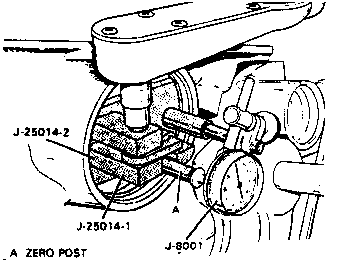 d. Install dial indicator J-8001 or equivalent, position dial indicator stem against zero post, then zero indicator.