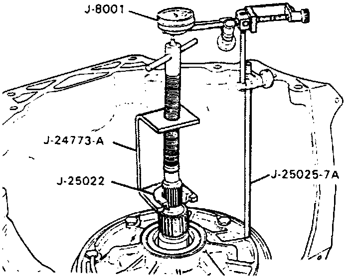 c. Install endplay fixture adapter J-25022 and oil pump remover and endplay checking fixture J-24773 or their equivalents, then dial indicator J-8001 or equivalent.