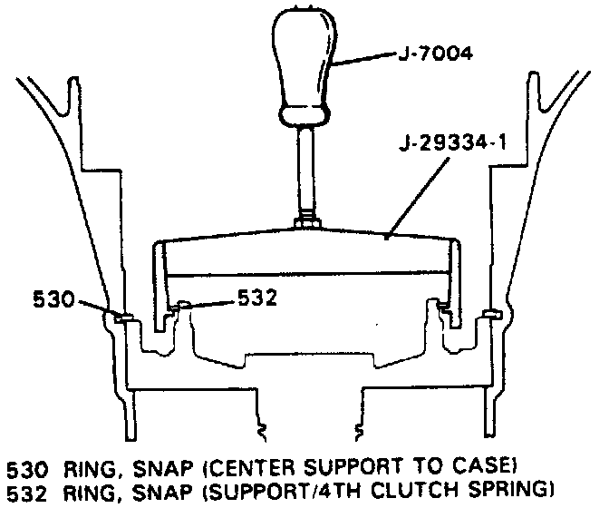 36. Install center support remover J-29334 and slide hammer J-7004 or their equivalents, using snap ring for support/4th clutch spring to support J-29334.