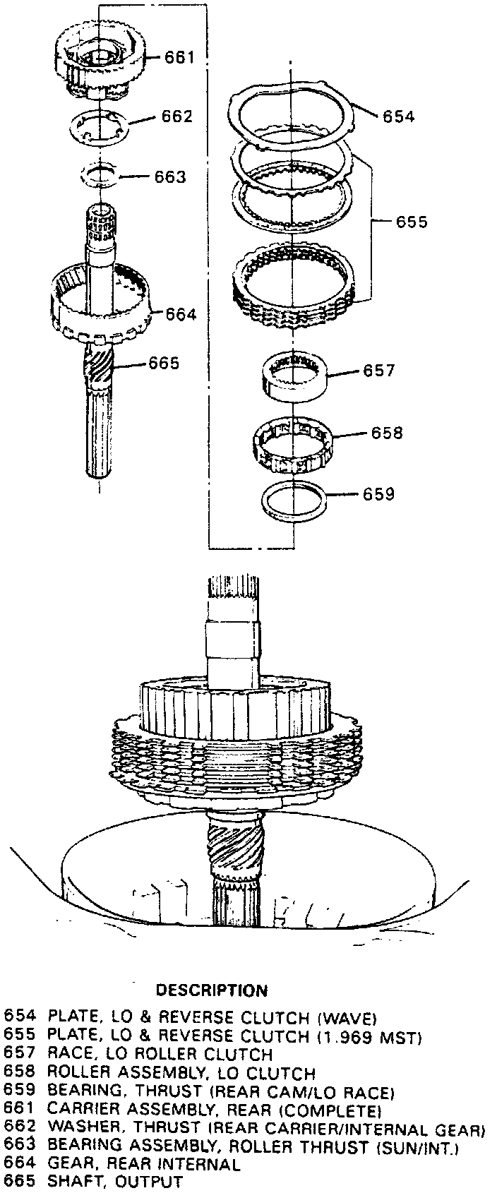 53. Remove thrust washer and wave plate, then the lo-reverse clutch plates and thrust washer. Rear internal gear is pressed onto output shaft. Do not remove internal gear.