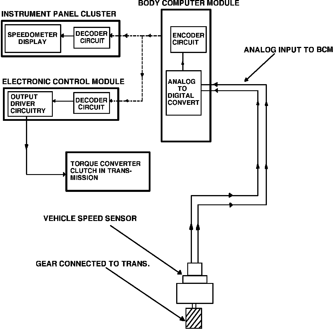 The BCM receives vehicle speed by monitoring the vehicle speed sensor, the speed sensors output is an analog signal (AC voltage). The BCM then converts this signal to a digital signal and assigns the addresses of the ECM and the IPC. The BCM now sends the signal out onto the data line. The ECM/PCM receives the vehicle speed and uses this input to control the transmission torque converter and other related engine functions. The IPC receives the input and displays vehicle speed on the instrument panel to inform the driver. Since vehicle speed is not needed for proper operation of the Heater A/C programmer and the ECC panel, the BCM did not assign their addresses to the information.