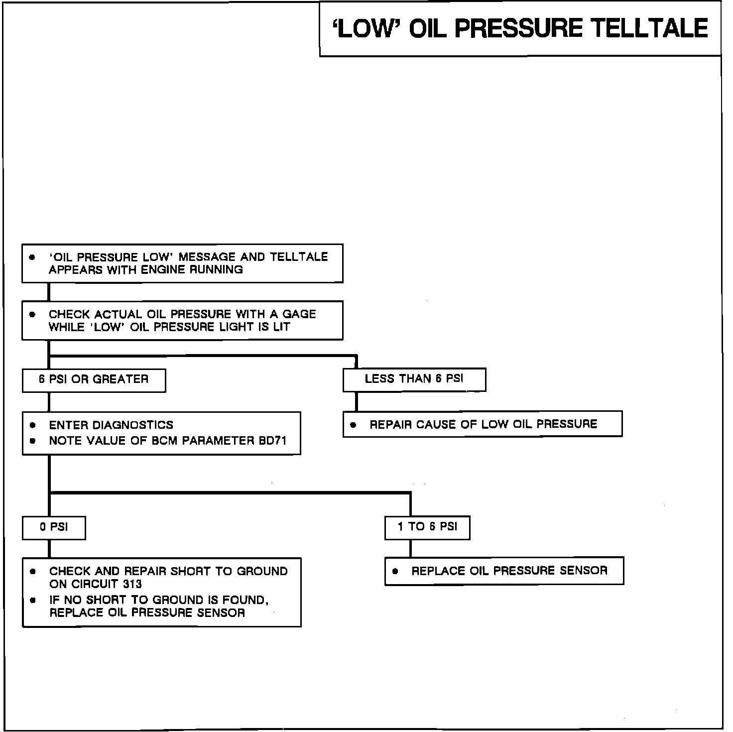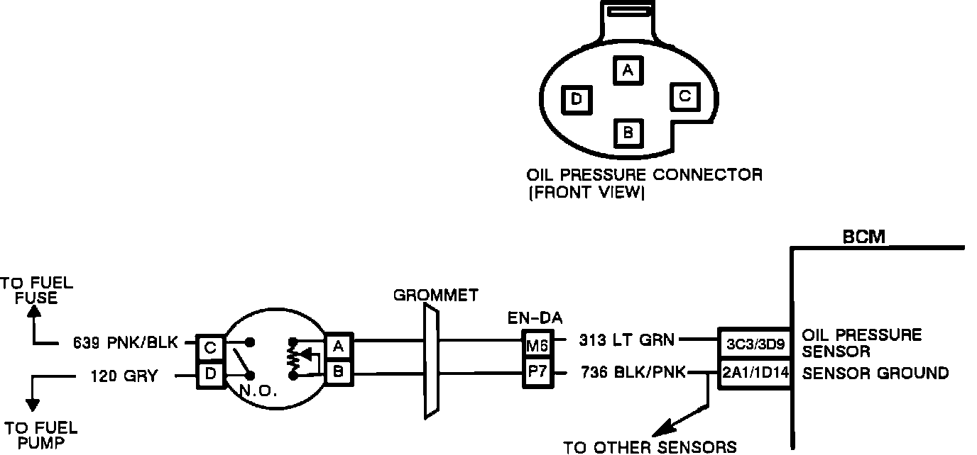The BCM provides voltage to the oil pressure circuit, and the oil pressure sensor provides the single path to ground. The BCM supplies and internally monitors the voltage level of the circuit at pin 3C3/3D9. The sensor acts like a variable resistor, when the oil pressure is high, resistance is high, and the BCM will detects high voltage. As the oil pressure decreases so will the voltage level sensed by the BCM at pin 3C3/3D9. The BCM will then calculate the oil pressure by the amount of voltage present, and when the calculated oil pressure drops below 6.0 psi, and all other failure conditions have been met, the BCM will illuminate the "OIL PRESSURE" telltale on the IPC.