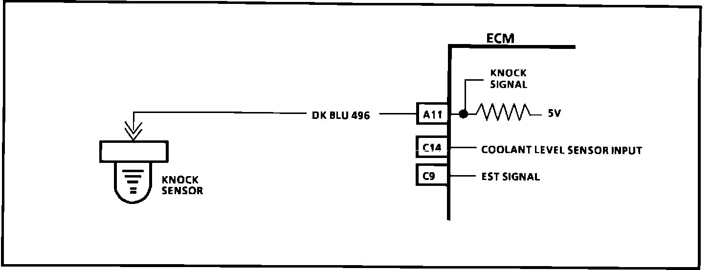 The knock sensor is used to detect engine detonation and the ECM will retard the electronic spark timing based on the signal being received. The circuitry, within the knock sensor, causes the ECM's 5.0 volts to be pulled down so that under a no knock condition, CKT 496 would measure about 2.5 volts. The knock sensor produces an AC signal, which rides on the 2.5 volts DC voltage. The amplitude and frequency are dependent upon the knock level.