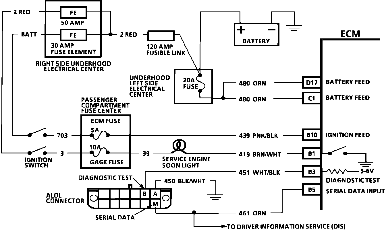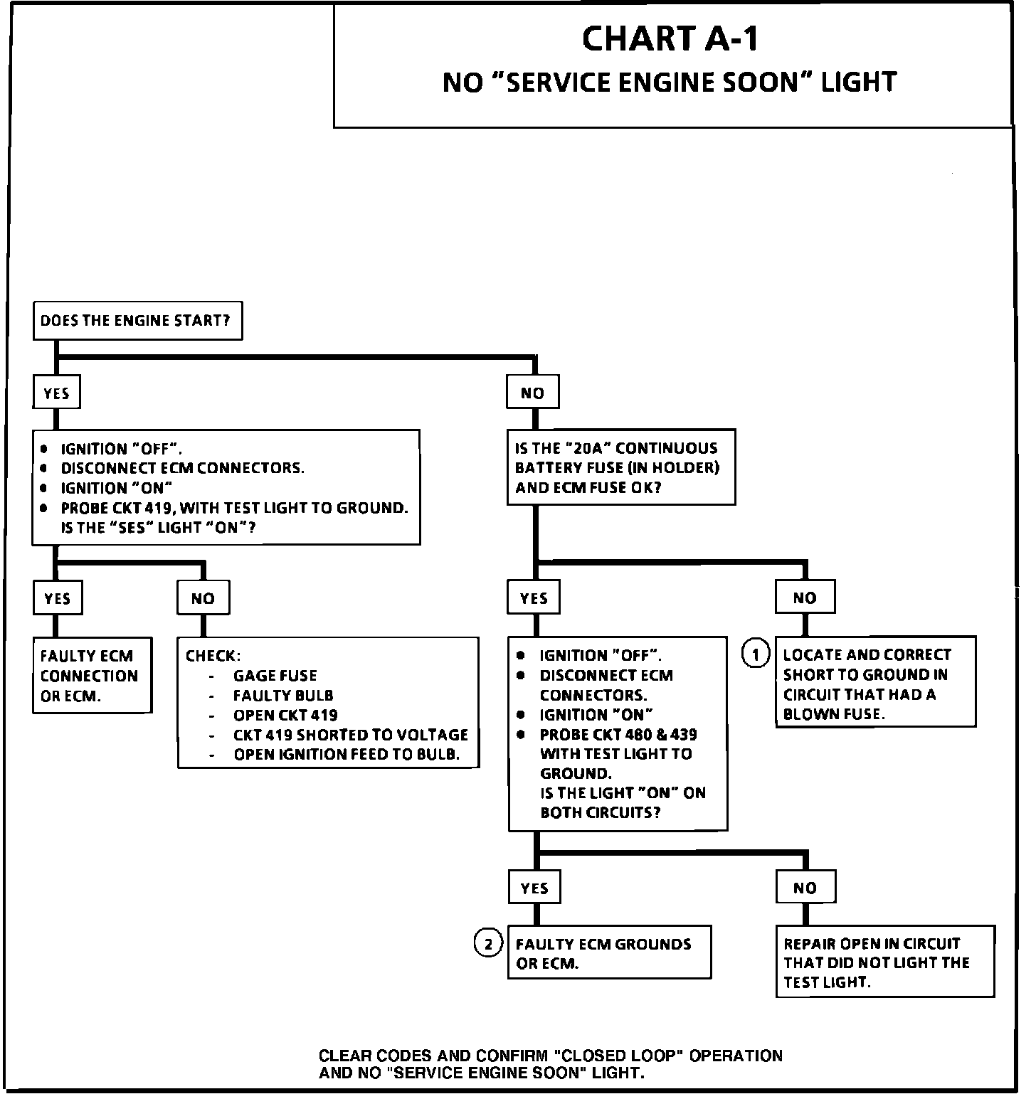 There should always be a steady "SERVICE ENGINE SOON" light when the ignition is "ON" and engine stopped. Battery voltage is supplied directly to the light bulb. The electronic control module (ECM) will control the light and turn it "ON" by providing a ground path through CKT 419 to the ECM.