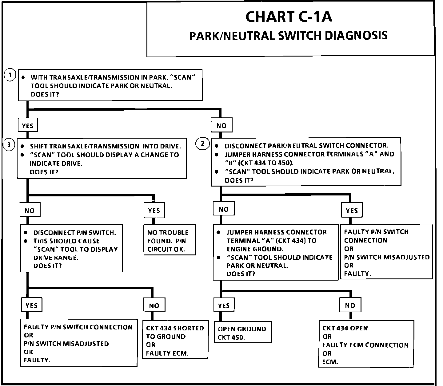 1. Checks for a closed switch to ground in park position. Different makes of "Scan" tools will read P/N differently. Refer to operators manual for type of display used for a specific tool.