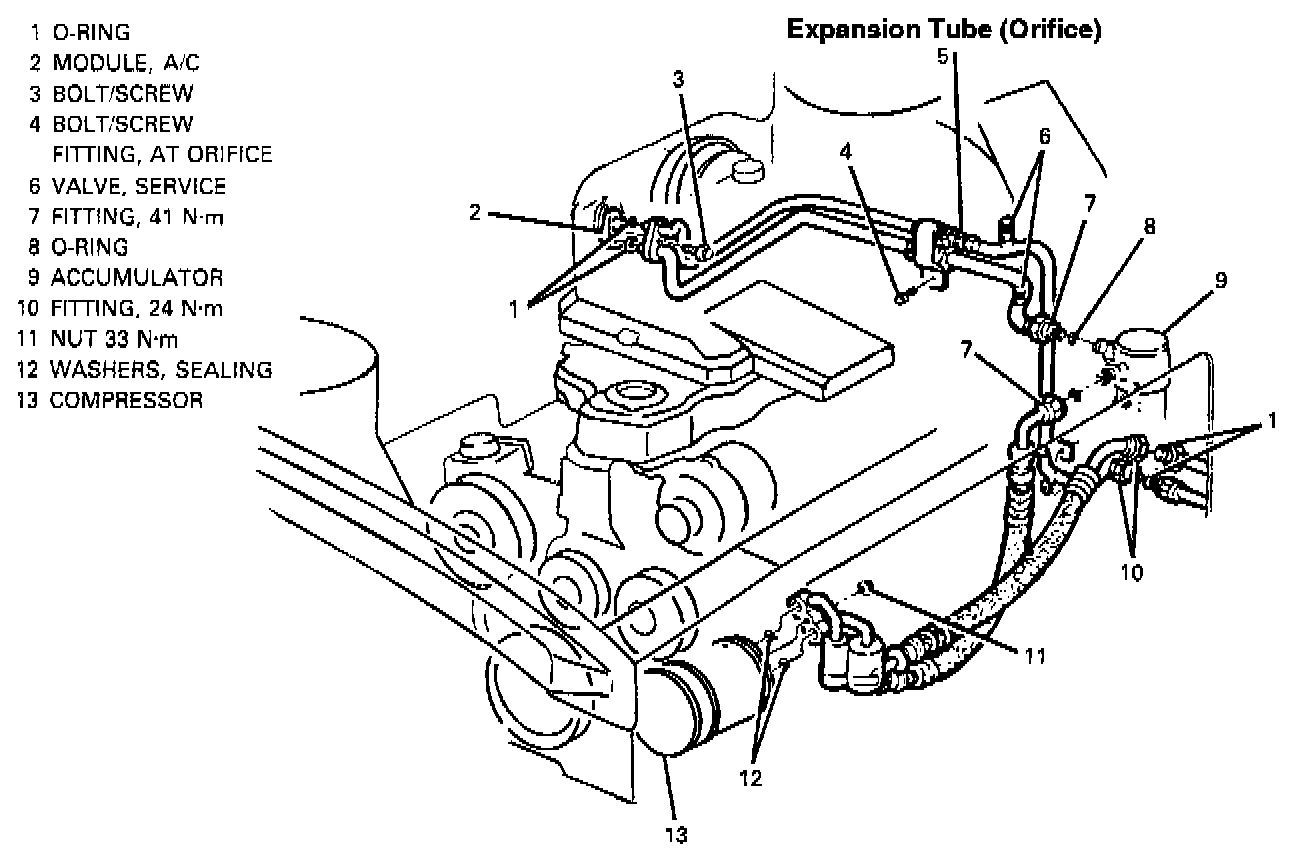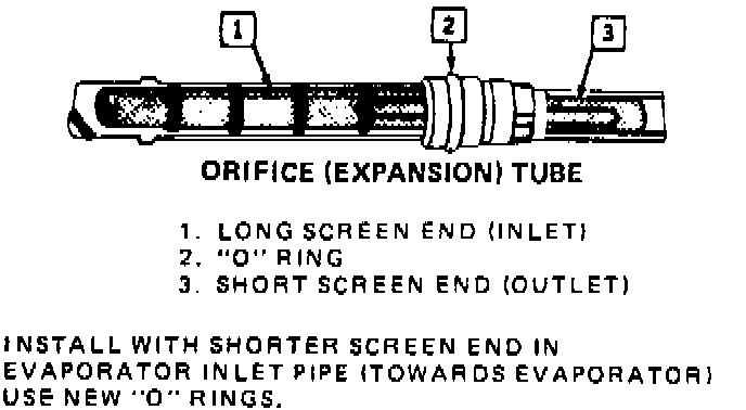 The Expansion tube (orifice) is located in the liquid line from the condenser to the evaporator at the fitting on inside left front fender.