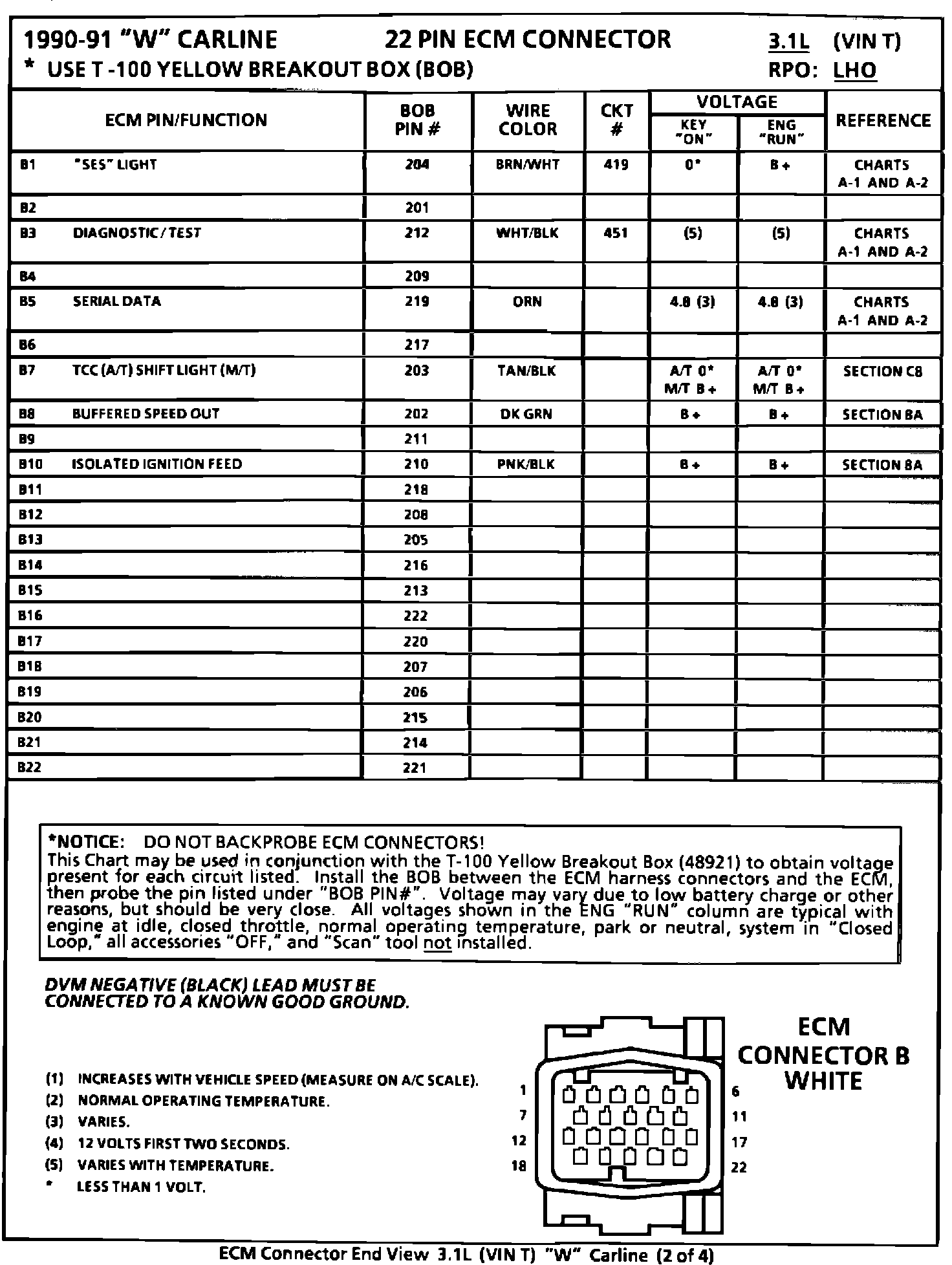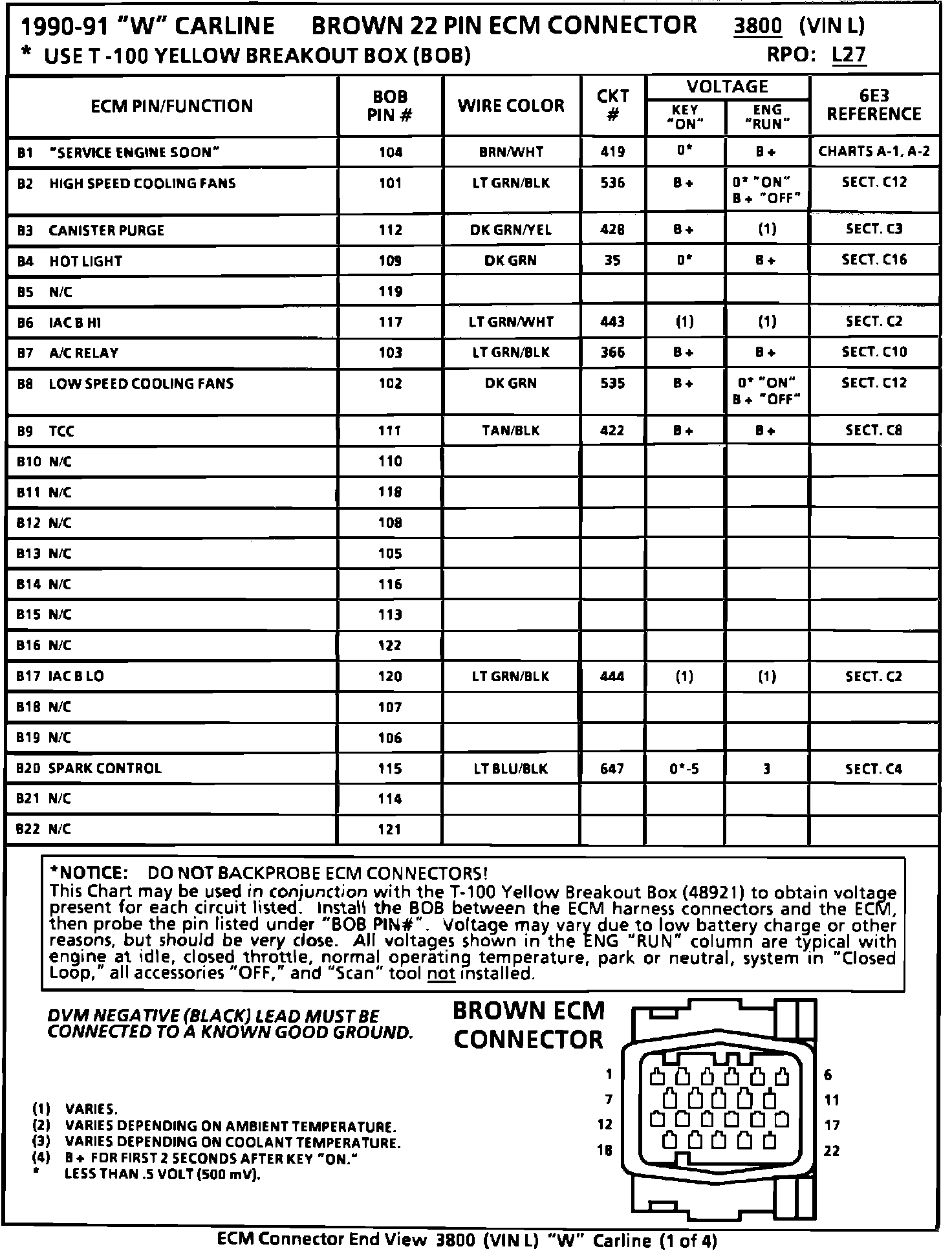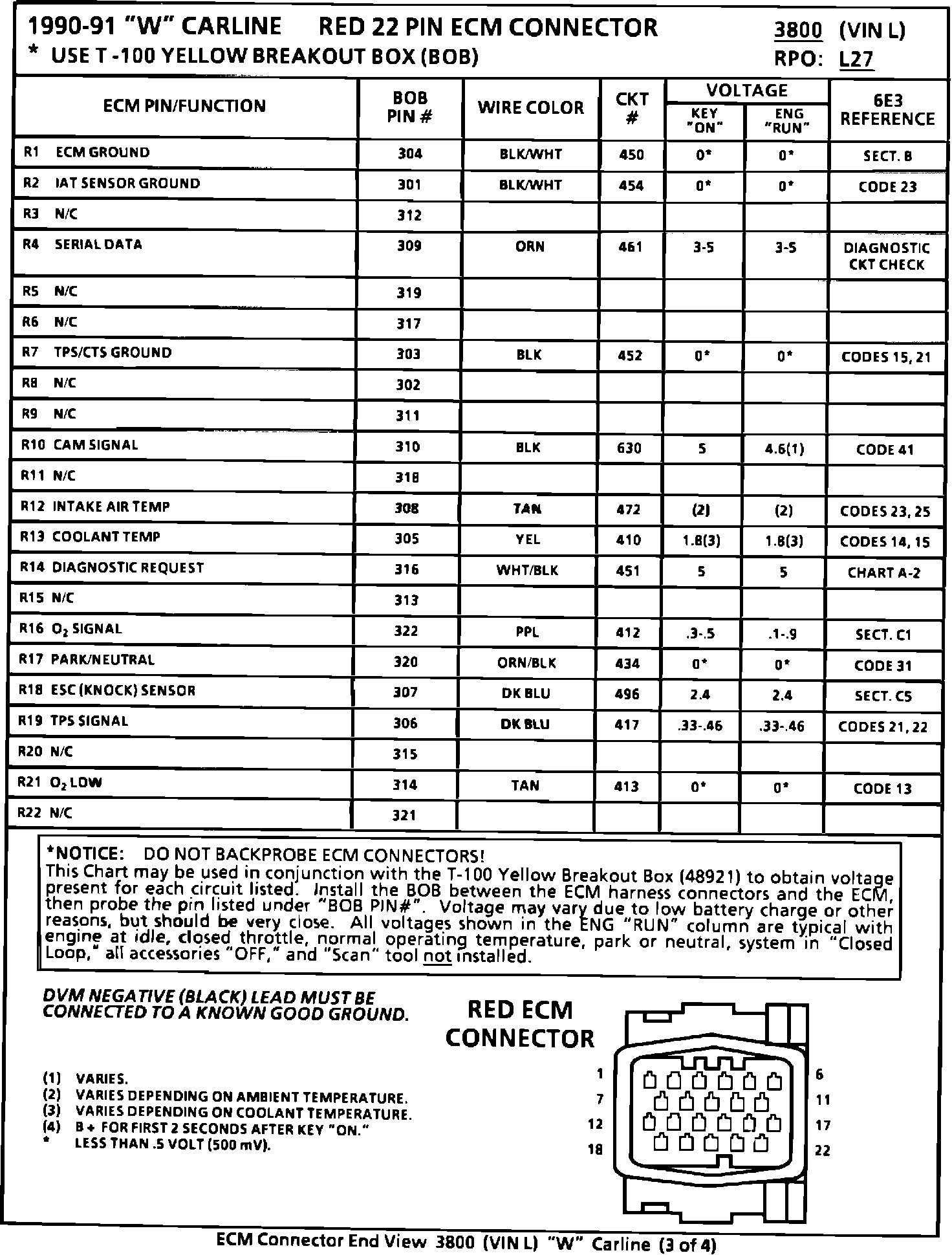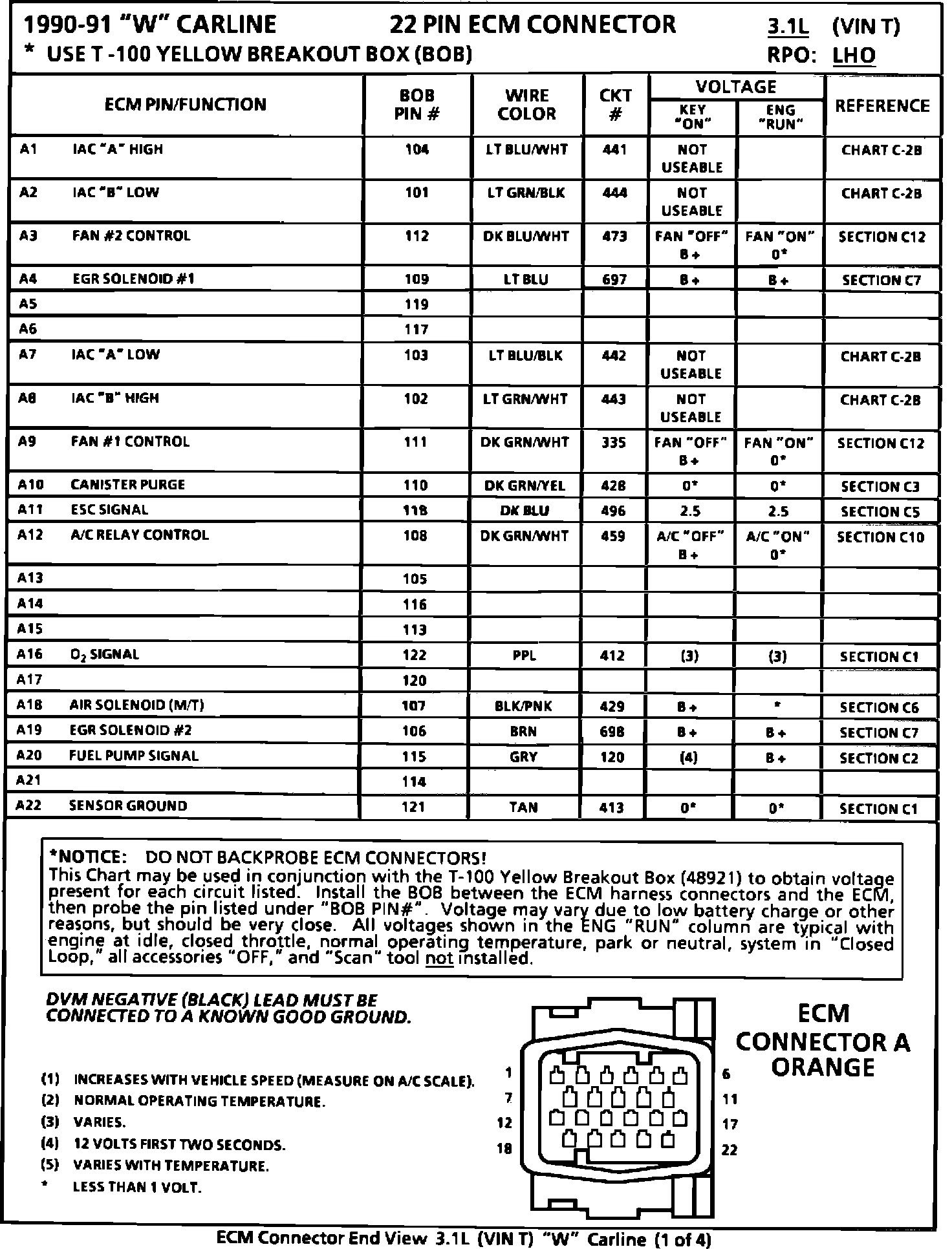 Service technicians have commented about the inability to read typical voltages in the Electronic Control Module (ECM) Connector End View charts. These charts are located in Service Manual Section "6E-A", "Driveability And Emissions." This condition has led to development of new charts. Vehicles equipped with the ECM in the engine compartment require the use of sealed electrical connections. The practice of "backprobing," piercing insulation, or otherwise breaching the integrity of circuits for diagnostic purposes is strongly not recommended.
