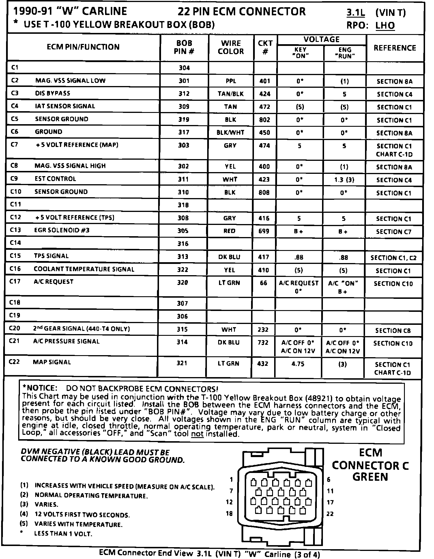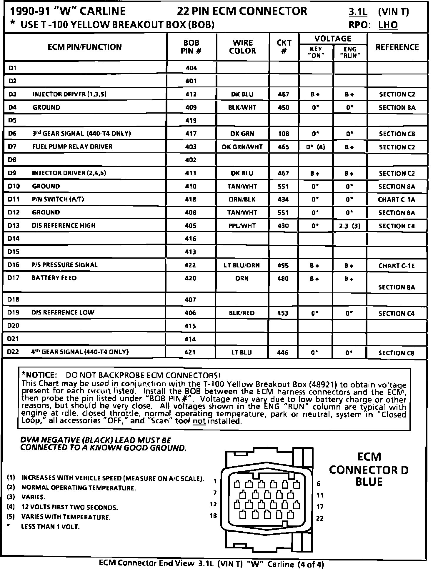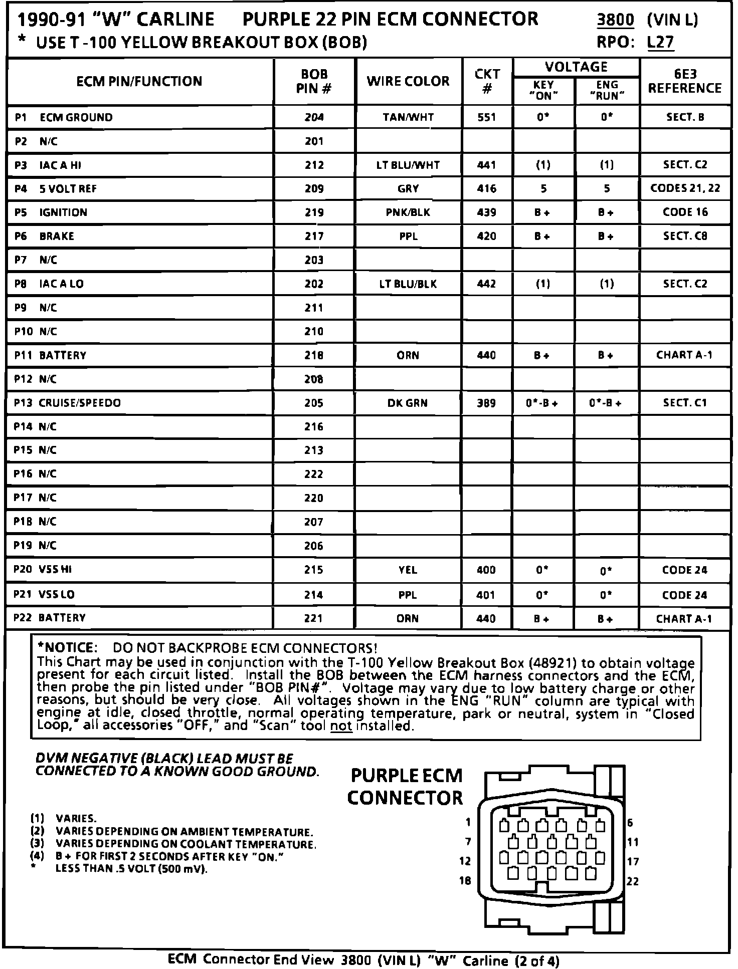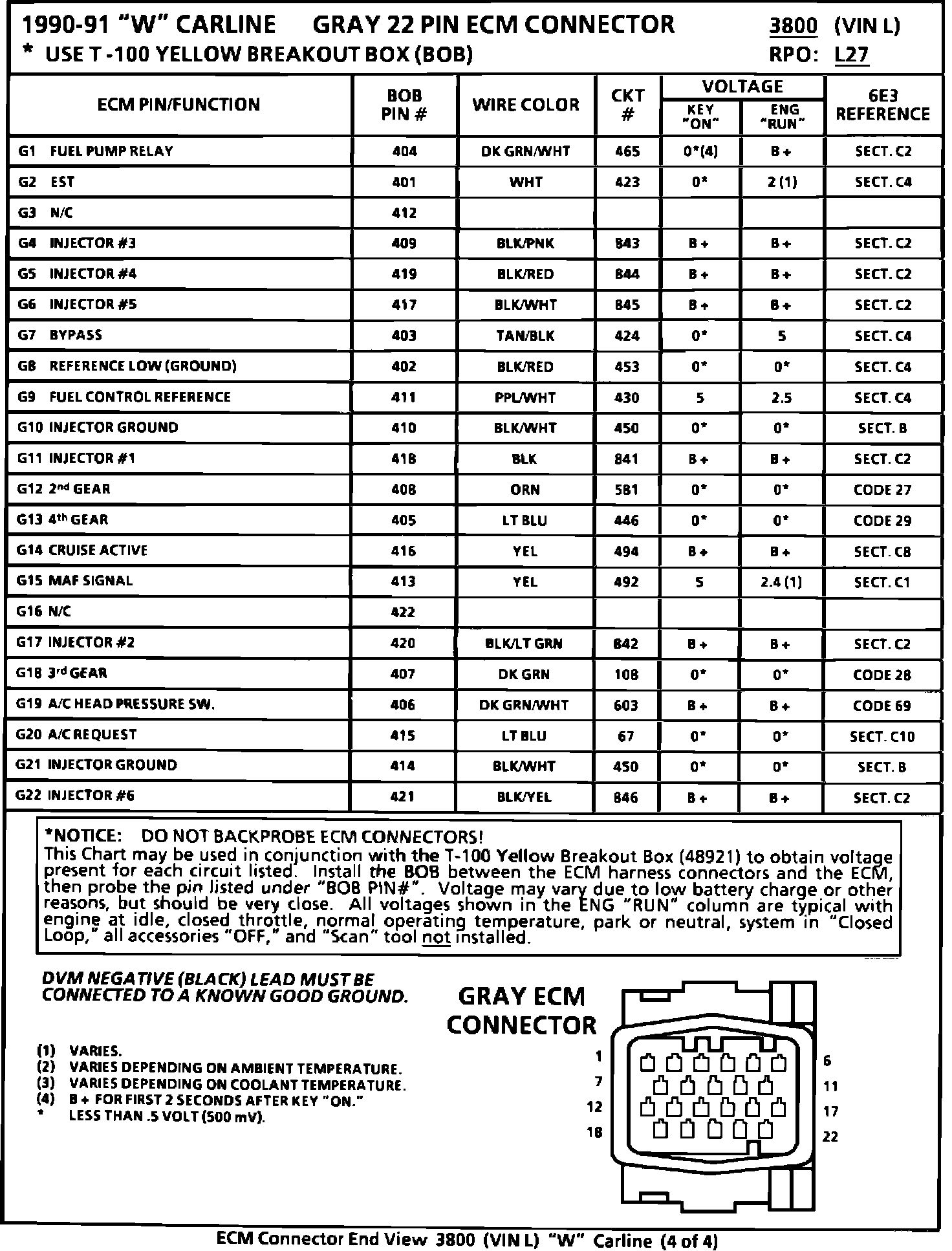 Service technicians have commented about the inability to read typical voltages in the Electronic Control Module (ECM) Connector End View charts. These charts are located in Service Manual Section "6E-A", "Driveability And Emissions." This condition has led to development of new charts. Vehicles equipped with the ECM in the engine compartment require the use of sealed electrical connections. The practice of "backprobing," piercing insulation, or otherwise breaching the integrity of circuits for diagnostic purposes is strongly not recommended.