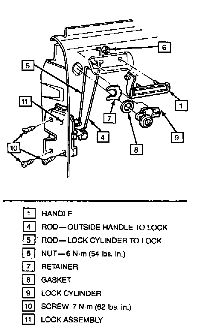 The door lock system was designed to prevent unlocking of the door using a flat tool. This system requires close tolerance on connecting, lock and push rods in addition to specific rods for each different application. In order to properly evaluate the lock system after a replacement part such as a rod, lock cylinder, pawl or bell crank has been installed, the following operational checks should be made.