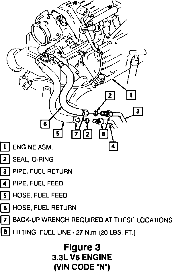 For 3.3L V6 engines (VIN Code "N"), see Figure (3); the fittings to be torqued are labelled "7" and "8" in Figure 3.