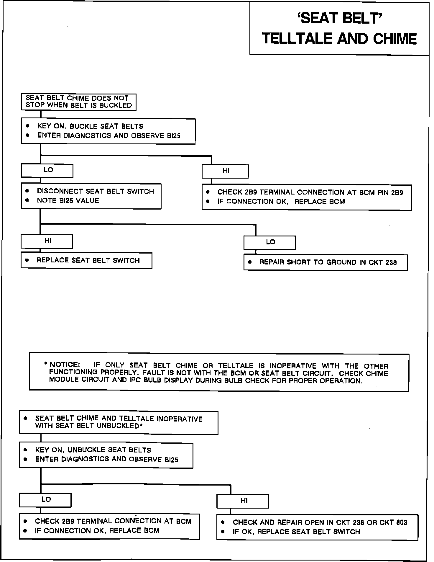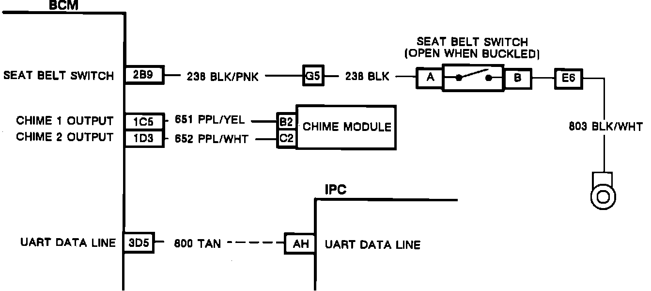 The BCM provides system voltage to the seat belt circuit, and the seat belt switch provides the single path to ground. The BCM supplies and internally monitors the seat belt circuit at pin 2B9. When the seat belt circuit is open the BCM will detect system voltage, but if the seat belt switch provides a path to ground (seat belt unbuckled), the BCM will detect low voltage. Once the BCM has determined that all of the failure conditions have been met, it will turn "ON" the slow paced chime on the chime module and the "SEAT BELT" indicator light on the IPC. If the seat belt switch opens prior to the 6.0 second time-out, the chime will stop but the indicator will remain lit for the duration of the time-out period.