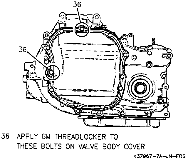 NOTE: It is necessary to use GM thread locker (P/N 12345382) or equivalent non-locking sealant to reduce the potential for fluid leaks on the indicated bolts.