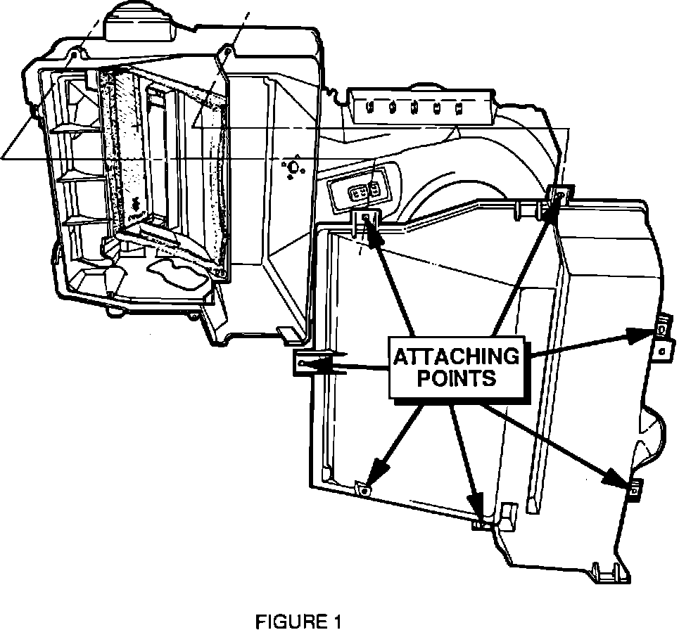1. Remove A/C Module Lower Evaporator Case per Service Manual, Section 1B. Front screw may be hidden by carpet and difficult to access. Use of a 7 mm flex head socket may be helpful. (See Figure 1 for attaching points).