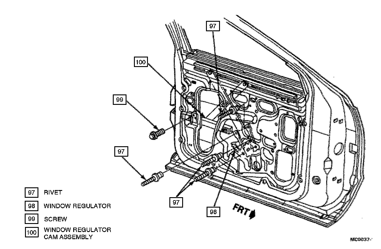 CAUTION: Tape the window glass to the door frame. If the glass drops into the door when the regulator is removed, personal injury or glass damage may result.