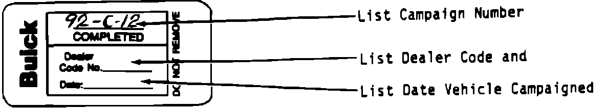 Each vehicle corrected in accordance with the instructions outlined in this bulletin will require a "Campaign Identification Label". Each label provides a space to include the five (5) digit dealer code of the dealer performing the campaign service. This information may be inserted with a typewriter or a ball-point pen.