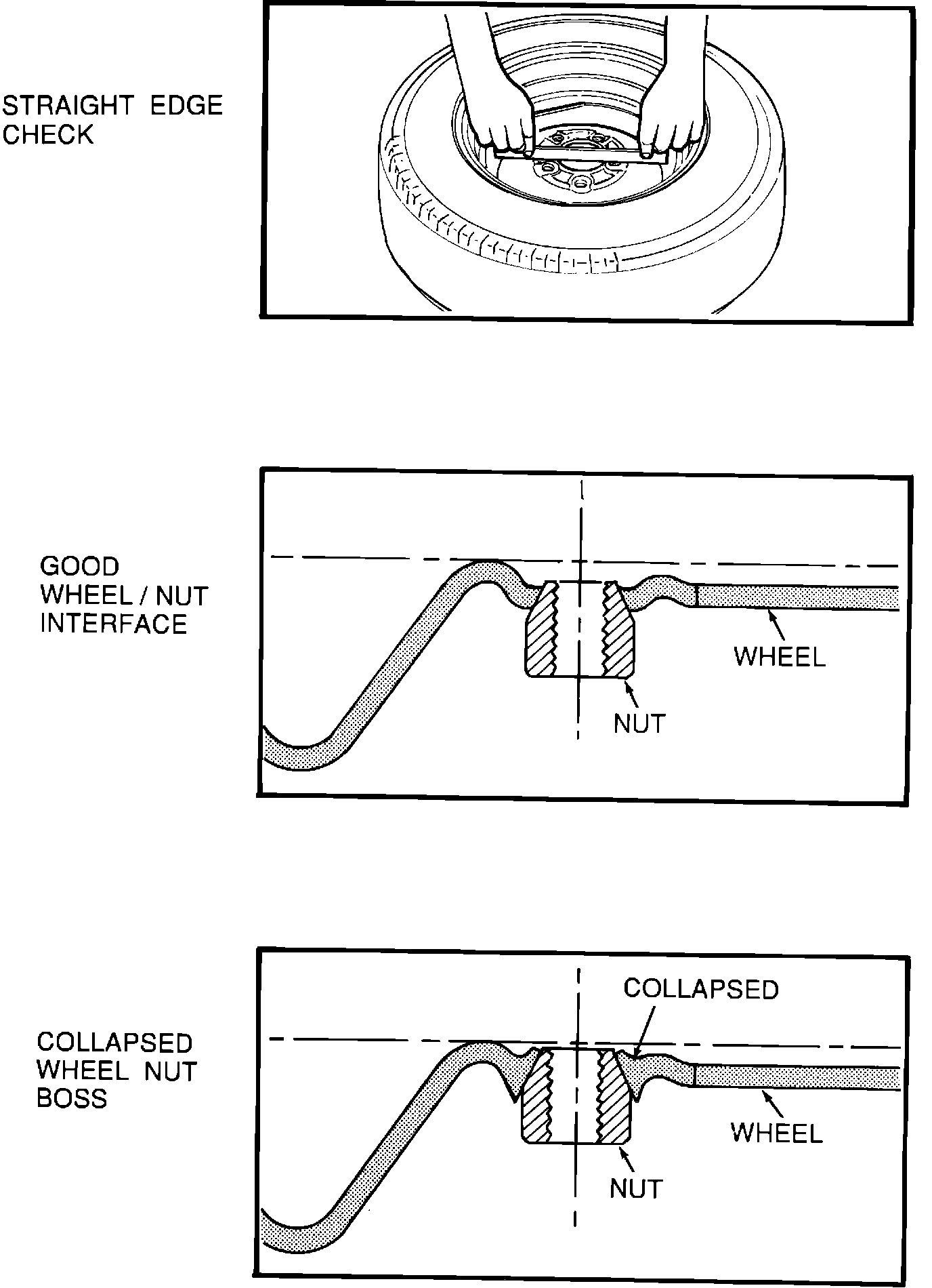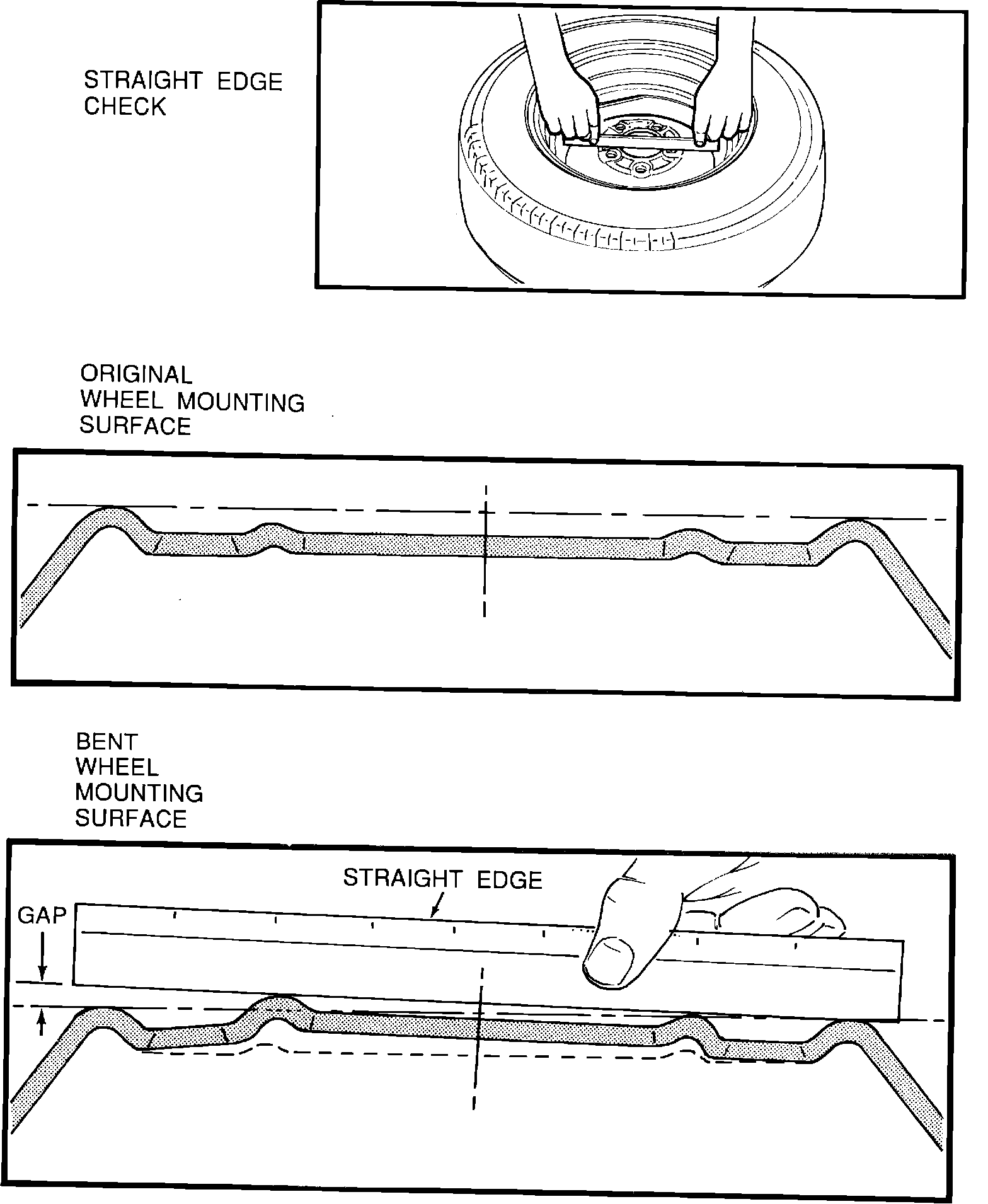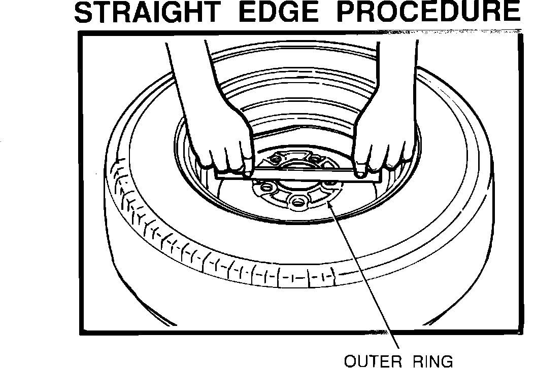 A. Obtain a straight edge approximately 8-9 inches long and, while holding it in two hands, as shown in the illustration, place it on the inboard mounting surface of the wheel and try to rock it up and down.