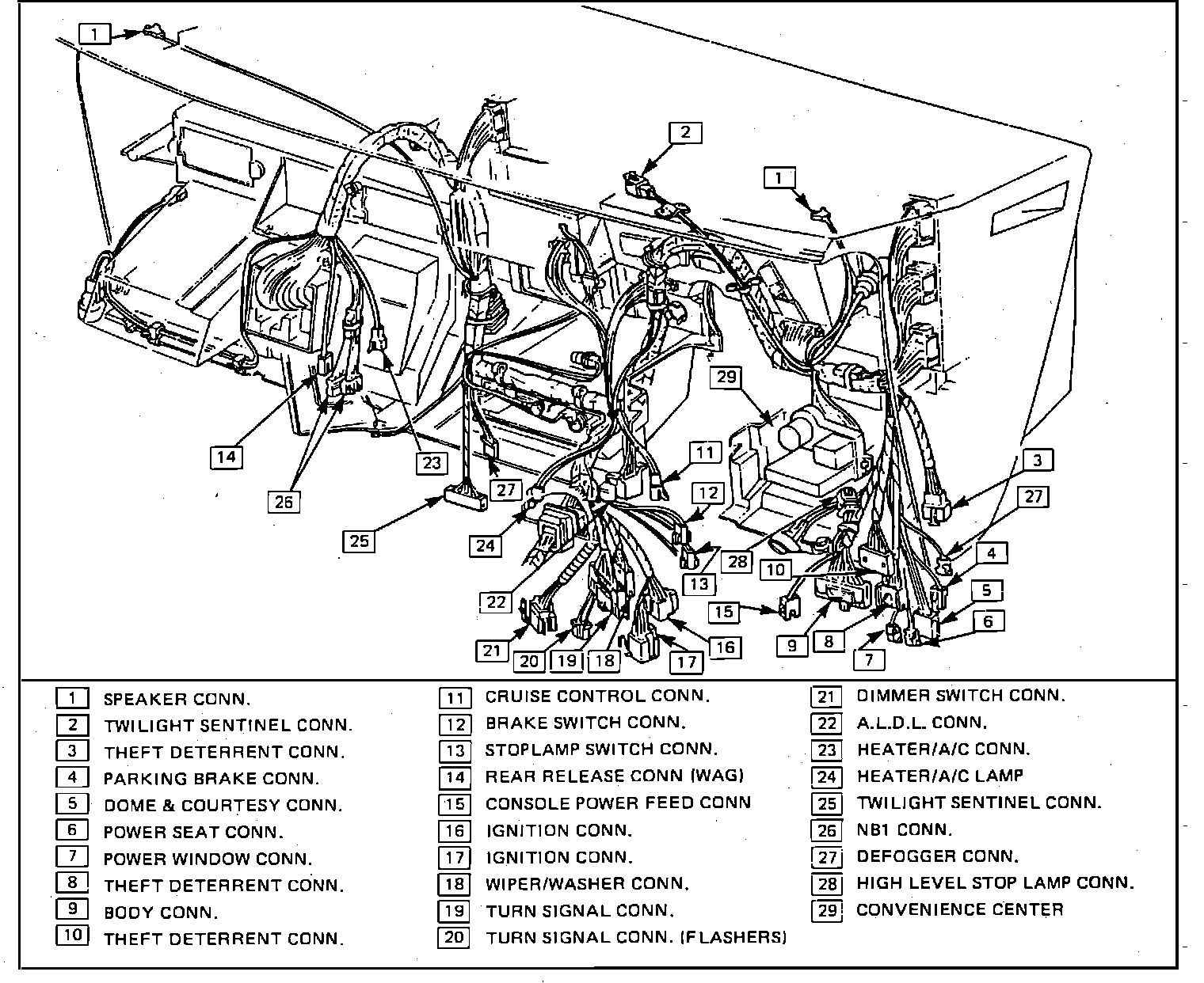 14. Disconnect emission harness connectors, antenna cable and side window defroster hoses.