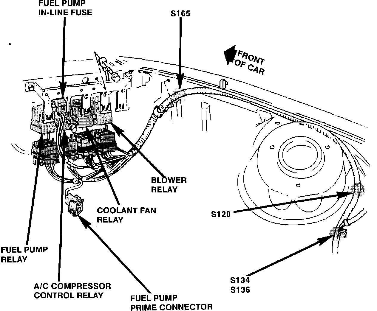 The fuel pump prime connector is located on the right front of engine compartment.