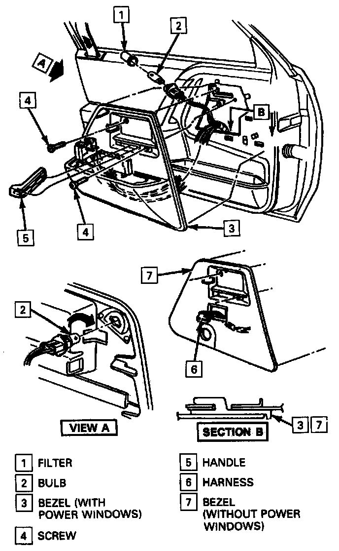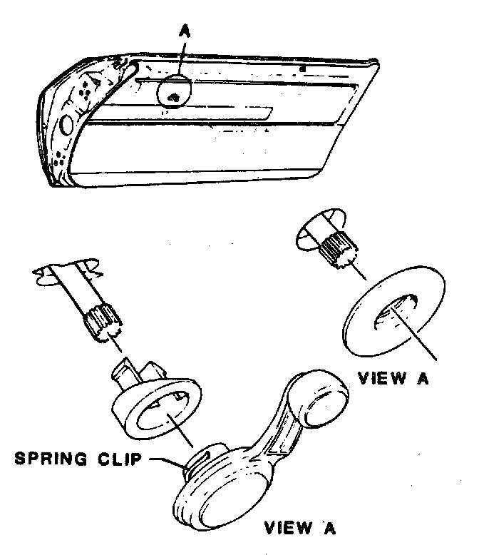 ^ Door inside handles are retained by either rivets or spring clips. On styles equipped with rivet retained handles, the rivets are covered by a screw retained remote control escutcheon.