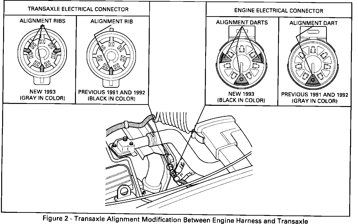 A redesigned transaxle electrical connector has been approved for all 1993 HYDRA-MATIC 4T60-E transaxles. The redesign involves the addition of two (2) alignment ribs to the electrical connector. The change also required that the engine connector be modified to accommodate the added alignment ribs.